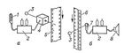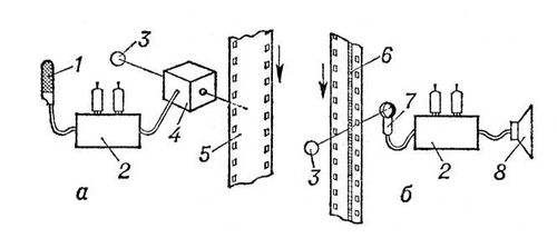Рис. 2. Схема фотографической записи (а) и её воспроизведения (б): 1 — микрофон; 2 — усилитель электрических колебаний; 3 — источник света; 4 — модулятор света; 5 — носитель записи (киноплёнка); 6 — дорожка записи (фотографическая фонограмма); 7 — фотоэлемент; 8 — громкоговоритель.