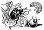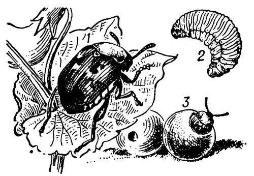 Зерновка гороховая: 1 — взрослый жук; 2 — личинка; 3 — поврежденные семена.