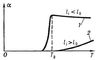 Рис. 2. Характерные зависимости степени поверхностной ионизации a в стационарных процессах от температуры T: 1 — для случая, когда теплота десорбции иона li, меньше теплоты десорбции нейтральной частицы l0; 2 — в случае, когда li>l0. T0 — температурный порог поверхностной ионизации.