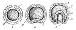 Рис. 1. Инвагинация (схема): А — стадия бластулы; Б — промежуточная стадия; В — стадия гаструлы; 1 — стенка зародыша; 2 — бластоцель; 3 — эктодерма; 4 — энтодерма; 5 — начало впячивания; 6 — гастроцель; 7 — бластопор.