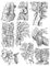 Эпифиты (на стволах и ветвях деревьев): 1 — печёночный мох (Frullania); 2 — папоротник (Platycerium); 3 — орхидея (Angraecum); 4 — лишайник (Alectoria); 5 — папоротник (Polypodium quercifolium); 6 — орхидея (Oncidium); 7 — дисхидия (Dischidia rafflesiana); общий вид и вскрытый мешковидный лист её, содержащий внутри собственные корни; 8 — тилландсия (Tillandsia usneoides); 9 — орхидея (Macrolepton).