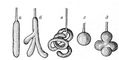 Рис. 1. Развитие желёз (схема): а — железистые клетки в эпителиальном пласте; б — одноклеточная слизистая железа (бокаловидная клетка); в — железистое поле; г — железистая ямка; д — железистая трубка, обособляющаяся от эпителиального пласта; е — формирование железы (дифференцировка аденомера) трубчатой формы и выводного протока; ж — формирование альвеолярной железы.