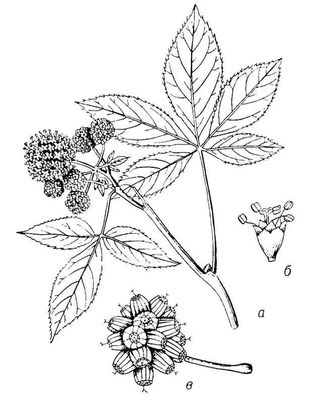 Акантопанакс сидячецветковый: а — часть побега с соцветием; б — цветок; в — плоды.