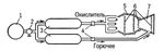 для 3-компонентных топлив. Масса двигателя, отнесённая к единице тяги, составляет 0,7—2 г/н; габаритные размеры изменяются в широких пределах. ЖРД бывают с однократным и многократным запуском, одно- и многокамерные. Ракетные силовые установки могут быть одно- и многодвигательные. Система подачи топлива в ЖРД может быть вытеснительная или с турбонасосным агрегатом (ТНА) (рис. 2). ЖРД с ТНА бывают 2 основных схем: без дожигания генераторного газа и с дожиганием. В ЖРД с ТНА без дожигания генераторного газа продукты газогенерации после срабатывания в турбине выбрасываются в окружающую среду через вспомогательные сопла, часто являющиеся рулевыми. Генераторный газ, продукт неполного сгорания, имеет относительно низкую температуру, а вспомогательные сопла меньшую степень расширения, чем основные, поэтому удельный импульс, получаемый при истечении продуктов сгорания через вспомогательные сопла, меньше удельного импульса основной камеры ЖРД, т. е. имеет место потеря удельного импульса. В ЖРД с дожиганием генераторного газа относительно низкотемпературные продукты газогенерации, получаемые из основных компонентов топлива, после срабатывания в турбине направляются в камеру ЖРД для дожигания. Такие ЖРД не имеют потери удельного импульса, обусловленной приводом ТНА. По назначению различают ЖРД: основные (маршевые), корректирующие, тормозные, рулевые; микроракетные ЖРД могут быть стабилизирующими и ориентационными. Обычно ЖРД работают при постоянном давлении в камере сгорания, но микроракетные двигатели бывают импульсными. Разрабатываются комбинированные двигатели, использующие ЖРД: турбо- и воздушноракетные. По роду окислителя ЖРД бывают: азотно-кислотные, азоттетроксидные, кислородные, перекисьводородные, фторные и др.