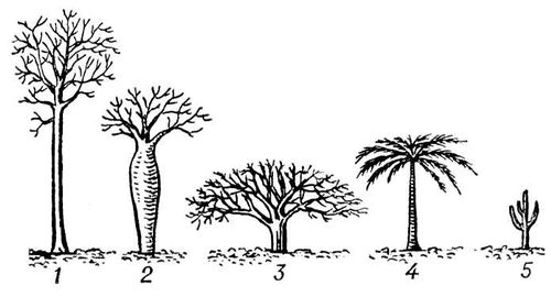 Рис. 4. Разнообразие жизненных форм деревьев: 1 — лесное дерево «обычного» типа; 2 — саванное дерево с водозапасающим стволом («бутылочное»); 3 — саванное дерево с зонтиковидной кроной; 4 — розеточное дерево (пальма); 5 — суккулентно-стеблевое дерево (кактус).