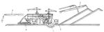 Схема черпаково-ленточного абзетцера с длиной консоли отвалообразователя 100 м и суточной производительностью 100000 м3 грунта: 1 — заборное (экскавационное) устройство; 2 — консольный ленточный отвалообразователь; 3 — положение отвальной консоли при нижней отсыпке отвала; 4 — черпаковая рама для планировки отвала; 5 — железнодорожный состав с пустой породой (вскрышей).