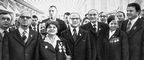 Первый секретарь ЦК СЕПГ Е. Хонеккер (в центре) и председатель Государственного совета ГДР В. Штоф (второй слева) среди делегатов съезда.