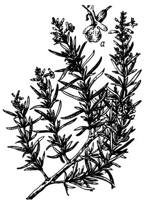 Розмарин лекарственный, цветущая ветка; а — цветок.