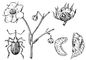 Малинно-земляничный долгоносик: 1 — жук; 2 — бутоны, поврежденные жуком; 3 — яйцо внутри скрытого бутона; 4 — личинка; 5 — куколка.