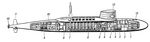 Рис. 3. Атомная ракетная подводная лодка: 1 — торпедный отсек; 2 — жилые помещения; 3 — столовая команды; 4 — пост управления запуска ракет; 5 — центральный пост; 6 — ракетный отсек; 7 — пусковая шахта; 8 — реактор; 9 — главные турбины; 10 — гребной винт; 11 — рули управления; 12 — спасательный (выходной) люк; 13 — ходовой мостик.