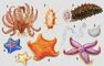 1 — Brisinga endecacnemos; офиуры: 2 — Ophiopholis aculeata, 3 — Asteroschema inornatum на ветке голубого коралла; морские ежи: 4 — плоский ёж Echinarachnius parma, 5 — Stylocidaris affinis, 6 — обыкновенный ёж Strongylocentrotus droebachiensis, 7 — обыкновенный ёж Brisaster townsendi.