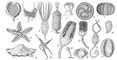 Рис. 1. Современные иглокожие. Морские лилии: 1 — Metacrinus rotundus, 2 — Heliometra glacialis; морские звёзды: 3 — Astropecten auranciacus, 4 — Acanthaster planci, 6 — Culcita coriacea; офиуры: 5 — Ophiura sarsi, 7 — Ophiacantha truncata, 8 — Asteronix loveni, 9 — Gorgonocephalus arcticus; морские ежи: 10 — Echinosigra paradoxa, 11 — Heterocentrotus mammillatus, 12 — Rotula augusti, 13 — Spatangus purpureus; голотурии: 14 — Cucumaria frondosa, 15 — Leptosynapta inhaerens, 16 — Pelagothuria natatrix.