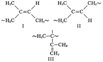 Изопреновые каучуки, синтетические каучуки, продукты полимеризации изопрена. Синтез И. к. в присутствии катализаторов стереоспецифической полимеризации (см. Полимеризация) приводит к образованию стереорегулярных полимеров, аналогичных по структуре натуральному каучуку. Катализаторами при получении И. к. служат комплексные соединения типа AlR3+TiX4, где R — алкил, Х — галоген (так называемые координационно-ионные катализаторы Циглера — Натты), литийорганические соединения, например литийалкилы, или металлический литий. Макромолекулы И. к. характеризуются высоким (65—99%) содержанием звеньев структуры 1,4-цис (I); они содержат также звенья 1,4-транс (II) и звенья 3,4 (III). И. к. с наибольшим содержанием звеньев 1,4-цис (92—99%) получают при их синтезе на комплексных катализаторах.
