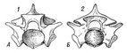 Рис. 1. Позвонок питона: А — спереди; Б — сзади; 1 — зигосфен; 2 — зигантрум.