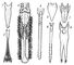 Рис. 1. Разнообразная форма языка у птиц: 1 — дрозда; 2 — медоноса; 3 —- крохаля; 4 — дятла; 5 — белого аиста; 6 — тукана; 7 — пустельги; 8 — ореховки.
