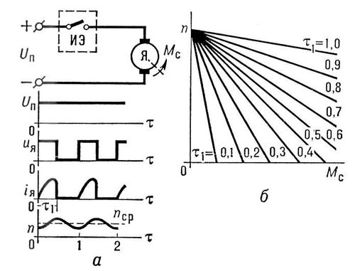 Импульсное регулирование частоты вращения электродвигателя: а — схема включения электродвигателя и временная диаграмма его работы; б — механические характеристики электропривода; ИЭ — импульсный элемент управления; Я — якорь электродвигателя; Uп — источник электроэнергии; Mc — нагрузка: uя — напряжение на якоре; iя — ток в якоре; n — частота врашения.