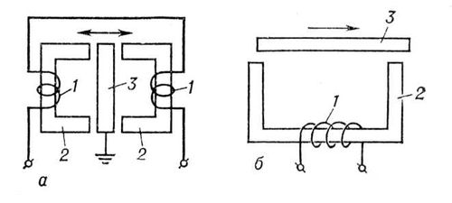 Схема конструкции индуктивного датчика: а — с переменным воздушным зазором; б — с переменной площадью воздушного зазора: 1 — катушка индуктивности; 2 — сердечник; 3 — якорь.