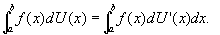 Если интегрирующая функция U(х) имеет ограниченную и интегрируемую по Риману производную U'(x), то интеграл Стилтьеса сводится к интегралу Римана по формуле