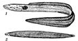 Морской угорь (Conger conger): 1 — взрослый; 2 — личинка-лептоцефал.