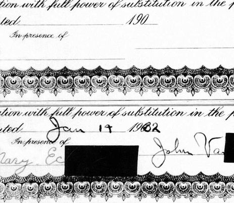 Фотографии части сертификата с обесцвеченной химически подписью и датой: вверху — в видимом свете, внизу — в инфракрасном излучении; на последней видны уничтоженные первоначально подпись и дата.
