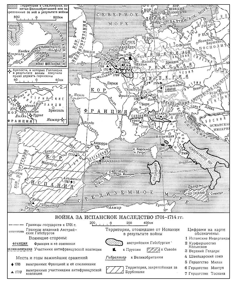 Испанское наследство, война за Испанское наследство, война 1701—14, вызванная длительной борьбой Франции с Габсбургами за гегемонию в Европе, а также выступлением на европейской политической арене молодых капиталистических государств — Англии и Голландии. Предлогом к войне послужило отсутствие мужского потомства у испанского короля Карла II Габсбурга. Основными претендентами на испанский престол (и обширные испанские владения в Европе и Америке) выступили монархи, имевшие потомство от браков с испанскими принцессами: французский король Людовик XIV (Бурбон), рассчитывавший получить испанскую корону для своего внука Филиппа Анжуйского, и император «Священной Римской империи» Леопольд I Габсбург, выставивший на испанский престол кандидатуру своего сына эрцгерцога Карла. Англия и Голландия, стремясь использовать начавшийся упадок Испании в своих интересах и не допустить усиления империи и Франции, настаивали на разделе испанских владений. Карл II под давлением французской дипломатии завещал испанский престол Филиппу Анжуйскому, который в 1700 после смерти Карла II и занял его (Филипп V). Англия и Голландия согласились с этим при условии независимости Испании от Франции и недопущения какой бы то ни было унии между ними. Но Людовик XIV, объявив (февраль 1701) Филиппа своим наследником, выявил тем самым намерение добиться объединения под одной короной Испании и Франции; фактически управление Испанией исходило от него. Англия и Голландия безуспешно добивались предоставления им торговых привилегий в испанских колониях. 7 сентября 1701 в Гааге Англия и Голландия заключили союз с императором «Священной Римской империи» против Франции (так называемый Большой альянс) и в мае 1702 объявили войну Франции (военные действия между имперскими и французскими войсками начались ещё в 1701 в Италии). Позднее к антифранцузской коалиции присоединились Бранденбург и большинство других германских княжеств, Дания, Португалия, а затем и бывший союзник Франции Савойя. Франция оказалась почти в полной изоляции; силы постоянного и могущественного союзника Франции — Швеции были надолго отвлечены Северной войной 1700—21.