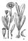 Календула лекарственная (ноготки); верхняя и нижняя части растения; а — трубчатый цветок, б — язычковый цветок, в — семянка.