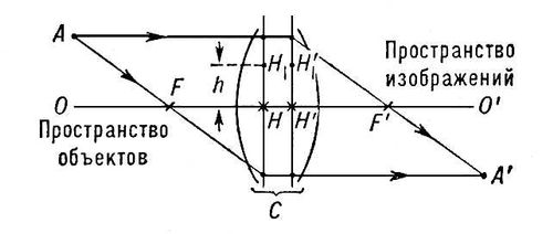 Илл. к ст. Кардинальные точки. Положение изображения A' произвольной точки А, даваемого оптической системой С, может быть найдено, если известны кардинальные точки системы F, F', Н и H': луч, проходящий через передний фокус F, направляется системой параллельно её оптической оси OO', а луч, падающий параллельно OO', после преломлений в системе проходит через задний фокус F'.