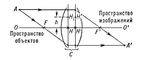 Кардинальные точки оптической системы, точки на оптической оси ОО' (рис.) центрированной оптической системы, с помощью которых может быть построено изображение произвольной точки пространства объектов в параксиальной области. Параксиальной называется область около оси симметрии оптической системы, где точка изображается точкой, прямая — прямой, а плоскость — плоскостью. К. т. оптической системы служат 4 точки (рис.): передний F и задний F' фокусы, передняя Н и задняя H' главные точки. Задний фокус является изображением бесконечно удалённой точки, расположенной на оптической оси в пространстве объектов, а передний фокус — изображением в пространстве объектов бесконечно удалённой точки пространства изображений. Главные точки — это точки пересечения с оптической осью главных плоскостей — плоскостей, взаимное изображение которых оптическая система С даёт в натуральную величину (всякая точка H1, расположенная в главной плоскости HH1 на расстоянии h от оси OO', изображается в др. главной плоскости H'H'1 точкой H'1 на том же расстоянии h от оси, что и точка H1).