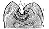 Кариес зуба: 1 — зона некроза (омертвения) эмали; 2 — зона размягчения; 3 — зона повышенной прозрачности эмали; 4 — эмалево-дентинная граница; 5 — зона прозрачного дентина; 6 — измененные одонтобласты.