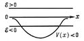 Уровни энергии. Рассмотрим поведение частицы в поле произвольной потенциальной ямы (рис. 5). Пусть потенциал отличен от нуля в некоторой ограниченной области, причем V < 0 (силы притяжения). При этом и классическое, и квантовое движения существенно различны в зависимости от того, положительна или отрицательна полная энергия E частицы. При E > 0 «классическая» частица проходит над ямой и удаляется от неё. Отличие квантовомеханического движения от классического состоит в том, что происходит частичное отражение волны от ямы; при этом возможные значения энергии ничем не ограничены — энергия частицы имеет непрерывный спектр. При E < 0 частица оказывается «запертой» внутри ямы. В классической механике эта ограниченность области движения абсолютна и возможна при любых значениях E < 0. В К. м. ситуация существенно меняется. Волновая функция должна затухать по обе стороны от ямы, т. е. иметь вид е—c|х|. Однако решение, удовлетворяющее этому условию, существует не при всех значениях E, а только при определённых дискретных значениях. Число таких дискретных значений En может быть конечным или бесконечным, но оно всегда счётно, т. е. может быть перенумеровано, и всегда имеется низшее значение E0 (лежащее выше дна потенциальной ямы); номер решения n называется квантовым числом. В этом случае говорят, что энергия системы имеет дискретный спектр. Дискретность допустимых значений энергии системы (или соответствующих частот