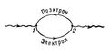 Графически процесс рождения и аннигиляции виртуальной электронно-позитронной пары изображен на рис. 8: фотон в точке 1 исчезает, порождая пару, которая затем аннигилирует в точке 2, в результате чего вновь образуется фотон. (Позитрон изображается такой же сплошной линией, как и электрон, на которой условно стрелка направлена в противоположную сторону, т. е. «вспять» во времени.)