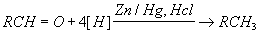 Клемменсена реакция, замена атома кислорода альдегидной или кетонной группы двумя атомами водорода при действии амальгамированного цинка и соляной кислоты: