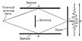 Рис. 2. Простейшее устройство, позволяющее получить две когерентные волны (интерферометр). Заслонка препятствует прямому прохождению света от источника к экрану.