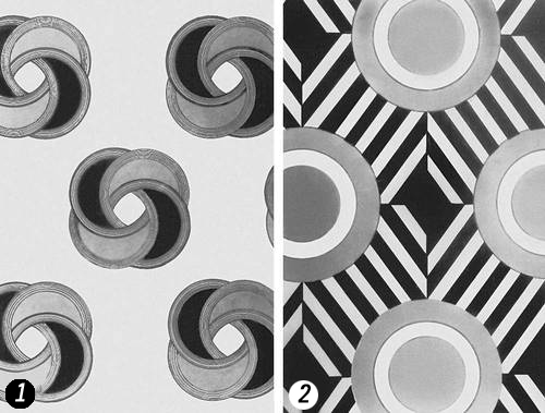 Эскизы рисунков для тканей: 1 — В. Ф. Степановой (гуашь, 1924, собрание В. А. Родченко, Москва); 2 — Л. С. Поповой (гуашь, 1924, собрание Д. В. Сарабьянова и Е. Б. Муриной, Москва).