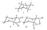 Рис. 5. Кресловидные конформации: циклогексана с аксиальными (а) и экваториальными (е) связями (I), ангидрида транс-циклогексан-1,2-дикарбоновой кислоты (II) и ангидрида цис-циклогексан-1,2-дикарбоновой кислоты (III).