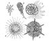 Корненожки: 1 — амёба; 2 — раковинная амёба; 3 — фораминифера; 4 — солнечник; 5 — радиолярия.