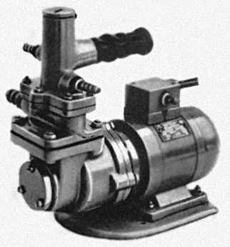 Электрический краскопульт ЭК: 1 — токоподводящий кабель; 2 — выключатель; 3 — электродвигатель; 4 — диафрагменный насос; 5 — штуцер для присоединения всасывающего шланга; 6 — штуцер для присоединения сливного шланга; 7 — перепускной клапан; 8 — рукоятка; 9 — штуцер для присоединения нагнетательного шланга с удочкой и форсункой.