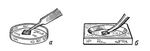 Рис. 1. Культура органа на «плоте» из сетчатой ткани: а — подготовка эксплантанта, б — перемещение культуры на часовое стекло.
