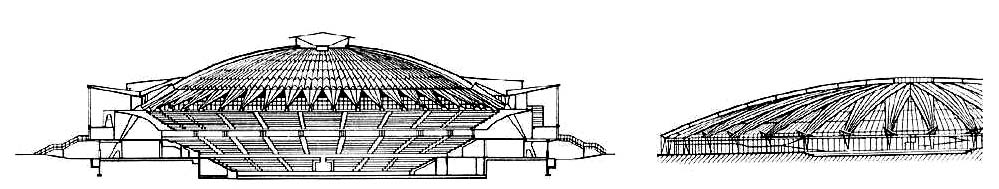 Купол. Слева — дворец спорта в Риме. 1958—60. Инж. П. Л. Нерви, арх. М. Пьячентини. Разрез. Справа — проект павильона «Строительство» на ВДНХ в Москве. 1963. Инж. Н. В. Никитин, арх. Б. С. Мезенцев и др. Схема разреза.