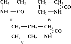 В зависимости от типа аминокарбоновых кислот, образующих Л., различают (b-, g-, d-, e-лактамы и т. д., например b-пропиолактам (III, tпл 73—74°С), g-бутиролактам (IV, tпл 24,6 °С), e-капролактам (V, tпл 68—69 °C):