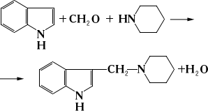 группу (аминометилирование) при действии формальдегида и аммиака (а также аминов или их хлористоводородных солей). В М. р. вступают различные соединения, содержащие подвижный атом водорода при атоме углерода: альдегиды и кетоны, имеющие водород у a-углеродного атома, производные малоновой кислоты, фенолы, гетероциклические соединения, углеводороды ацетиленового ряда и другие. Ниже приведены уравнения реакций для ацетона и индола; в первом случае использован солянокислый диметиламин, во втором — пиперидин: