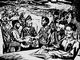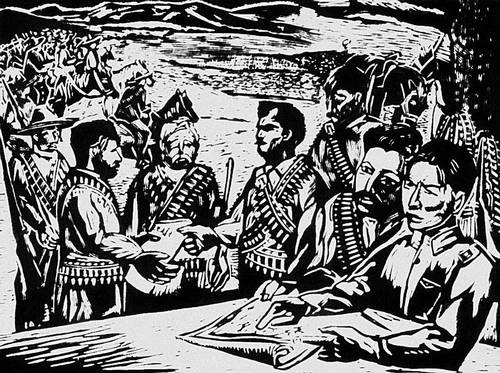 Революционные войска приступают к наделению крестьян землёй. Матаморос. 1913. (Из альбома «Образы мексиканской революции». 1947. Линогравюра И. Агирре.)