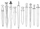 Мечи: 1—2 — древнейшие типы бронзовых мечей; 3 — древнейший тип европейских железных мечей (гальштатская культура); 4 — скифский меч акинак; 5 — меч латенской культуры (5—1 вв. до н. э.); 6 — римский меч гладиус; 7 — длинный римский меч спата; 8—9 — древнерусские мечи (9—11 и 12—13 вв.); 10 — кавалерийский меч Ближнего Востока.