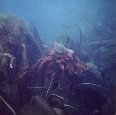 Зелёные и багряные водоросли на границе литорали и сублиторали; среди них животные - асцидия, звезда, ежи, голотурия.