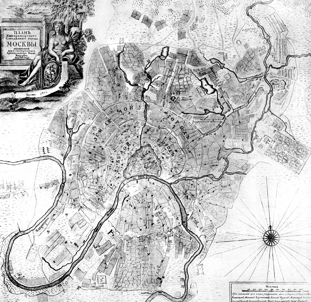 В конце 17 — начале 18 вв. делаются попытки регулярной планировки городских кварталов. Специальный указ 1704 установил новую границу М. по Камер-Коллежскому валу и требовал застройки центра М. каменными зданиями по красной линии, однако большая часть сооружений продолжала оставаться деревянной. Для урегулирования дальнейшего строительства в М. архитекторами И. Ф. Мичуриным и И. А. Мордвиновым был составлен первый план М. (1731—39; см. илл.). Появились постройки, повторяющие традиционные формы сооружений 17 в., но с применением ордера; складывается стиль барокко [церкви Архангела Гавриила (Меншикова башня; начата в 1701, в 1704—07 — архитектор И. П. Зарудный; см. илл.), Ивана Воина (1709—13, приписывается И. П. Зарудному), дом Апраксиных (1766)]. Во 2-й половине 18 в. в большом и разнообразном строительстве М. получил блестящее развитие русский классицизм. Строились крупные общественные здания, получил архитектурную завершённость тип дворянской городской усадьбы [Пашков дом (ныне один из корпусов Библиотеки СССР имени В. И. Ленина; 1784—86, архитектор В. И. Баженов); «Благородное собрание» (см. Дом Союзов), Голицынская больница (ныне корпус 1-й городской больницы; 1796—1801; см. илл.), дома Демидова (ныне институт инженеров геодезии, аэрофотосъёмки и картографии: 1779—91), Барышникова (ныне институт санитарного просвещения; 1797—1802), церкви Филиппа Митрополита (1777—88), Косьмы и Дамиана (1791—1803) — все архитектор М. Ф. Казаков; Воспитательный дом (1764—70, архитектор К. И. Бланк, при участии архитектора М. Ф. Казакова), Странноприимный дом (ныне институт скорой помощи им. И. В. Склифосовского, 1794—1807, архитекторы Е. С. Назаров, Дж. Кваренги и др.; см. илл.)]. В конце 18 в. по кольцу Белого города были заложены бульвары (архитектор С. А. Карин; первый — Тверской бульвар, 1796), с площадями в местах пересечения с радиальными улицами. Во 2-й половине 18 — начале 19 вв. сложились ансамбли подмосковных усадеб (ныне в черте М.) — Кускова, Останкина, Царицына. Наряду с богатыми усадьбами, на окраинах, в районах бывших слобод, беспорядочно росли жилища ремесленников и рабочих московских фабрик. Деревянные домики, лавки и мастерские были разбросаны по всему городу.