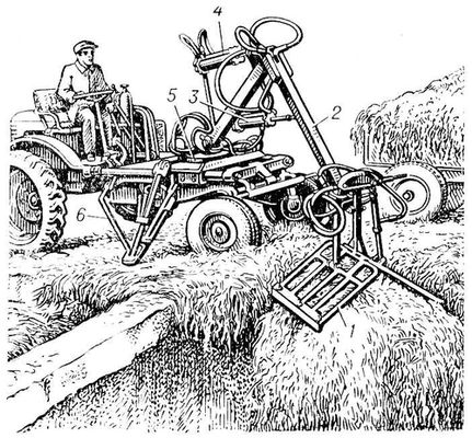 Рис. 2. Навесной навозопогрузчик: 1 грейфер; 2 — стрела; 3 и 4 — гидроцилиндры; 5 — основание колонны; 6 — гидравлическая опора.