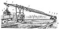 Рис. 1. Крановый навозопогрузчик: 1 — виброгрейфер; 2 — вибратор; 3 — подвижная каретка; 4 — трос управления виброгрейфером; 5 — кран-балка; 6 — тяговый трос; 7 — электродвигатель; 8 — червячный редуктор; 9 — лебёдка; 10 — опорная тележка; 11 — ось механизма передвижения навозопогрузчика; 12 — анкерная опора.