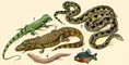 Характерные животные Неотропической области: 1 — игуана; 2 — кайман; 3 — анаконда; 4 — лепидосирен; 5 — большая пиранья.