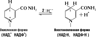 Во многих окислительно-восстановительных реакциях НАД или НАДФ присоединяют протон и 2 электрона, переносимые от окисляемого субстрата к окисленному коферменту; в обратной реакции водород переносится от восстановленного кофермента к субстрату. При этом водород отщепляется и присоединяется к атому углерода амида никотиновой кислоты в 4-м положении: