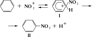 Н. ароматических соединений осуществляется азотной кислотой, нитрующими смесями или неорганическими солями нитрония NO; вначале образуется комплекс (I) между катионом нитрония и бензолом: